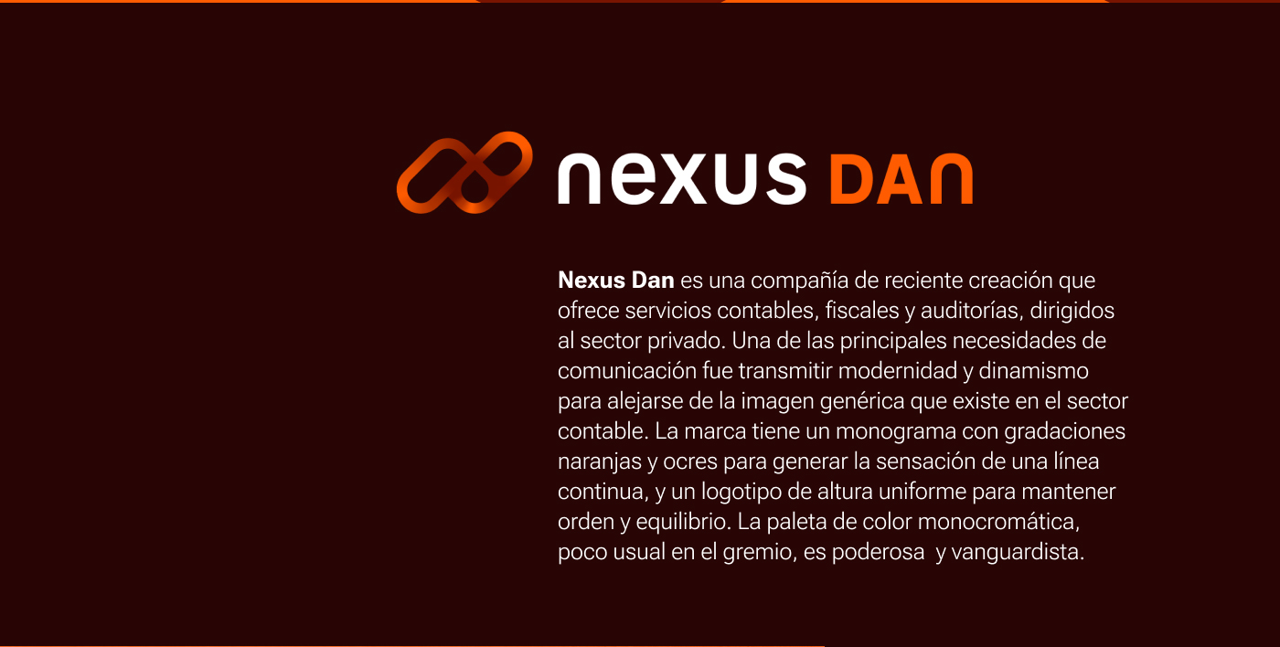 Nexus Dan es una compañía de reciente creación que ofrece servicios contables, fiscales y auditorías, dirigidos al sector privado. Una de las principales necesidades de comunicación fue transmitir modernidad y dinamismo para alejarse de la imagen genérica que existe en el sector contable. La marca tiene un monograma con gradaciones naranjas y ocres para generar la sensación de una línea continua, y un logotipo de altura uniforme para mantener orden y equilibrio. La paleta de color monocromática, poco usual en el gremio, es poderosa y vanguardista.