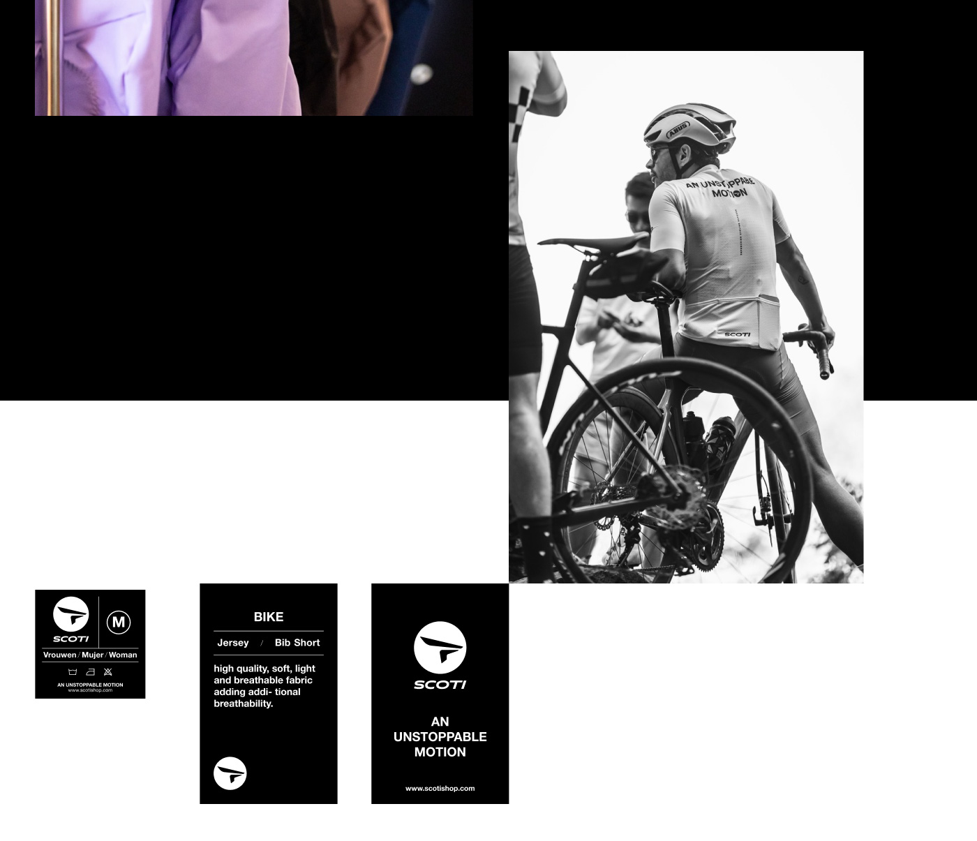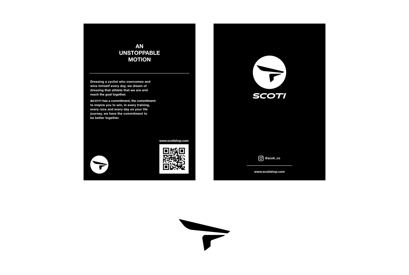 Scoti es una compañía holandesa dedicada al diseño de ropa para ciclistas, enfocada en la innovación, confort y durabilidad de sus prendas. La identidad visual sugiere audacia, movimiento y se adapta de forma sutil a la línea de productos, siendo flexible para abonar a los conceptos creativos de la marca.