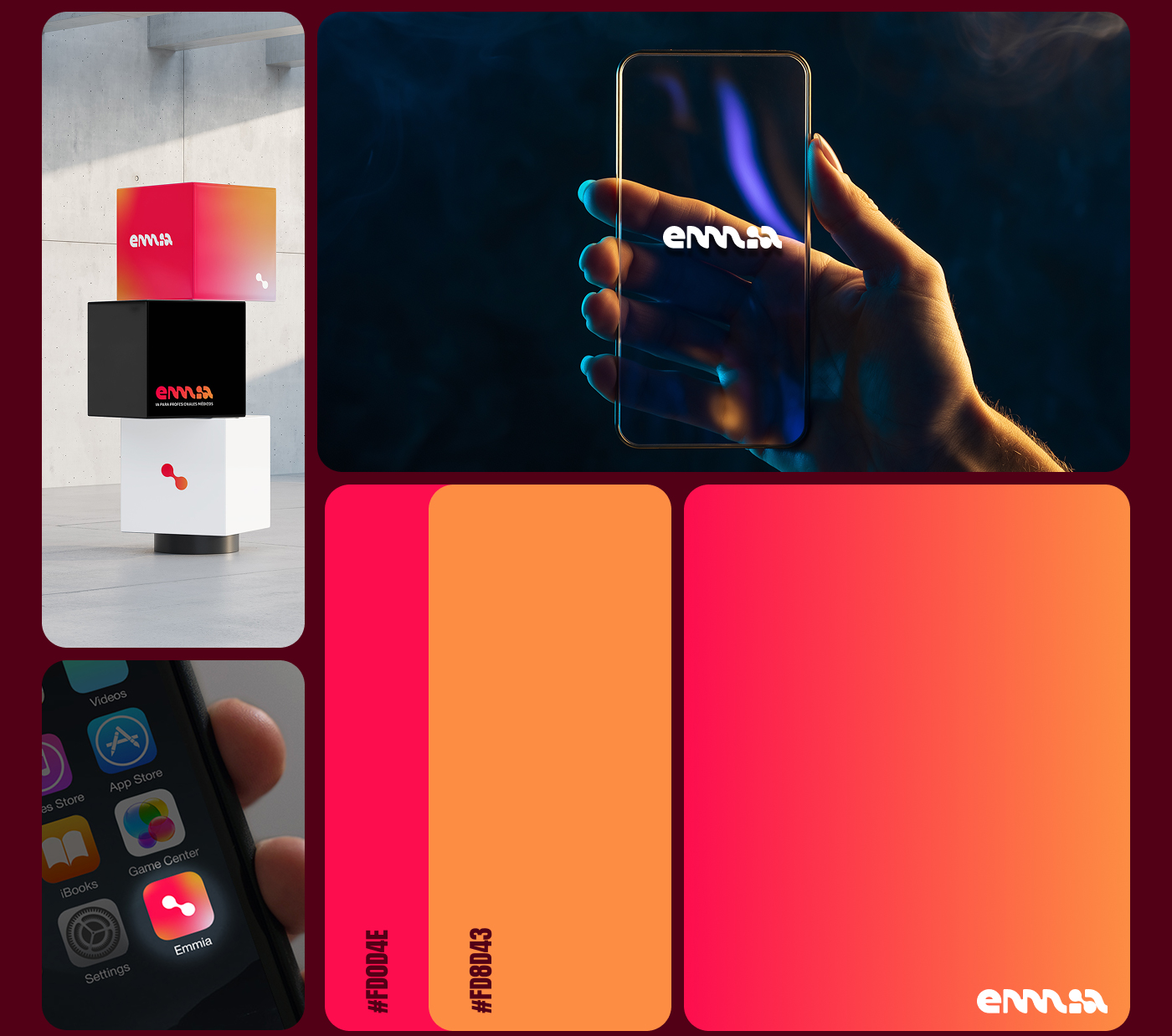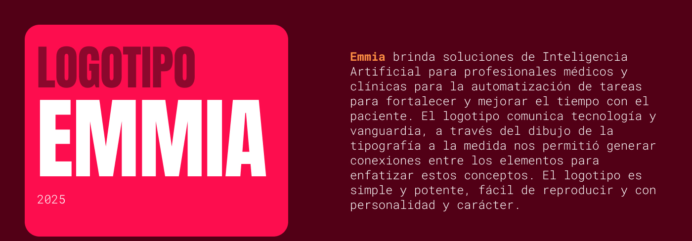 Emmia brinda soluciones de Inteligencia Artificial para profesionales médicos y clínicas para la automatización de tareas para fortalecer y mejorar el tiempo con el paciente. El logotipo comunica tecnología y vanguardia, a través del dibujo de la tipografía a la medida nos permitió generar conexiones entre los elementos para enfatizar estos conceptos. El logotipo es simple y potente, fácil de reproducir y con personalidad y carácter.